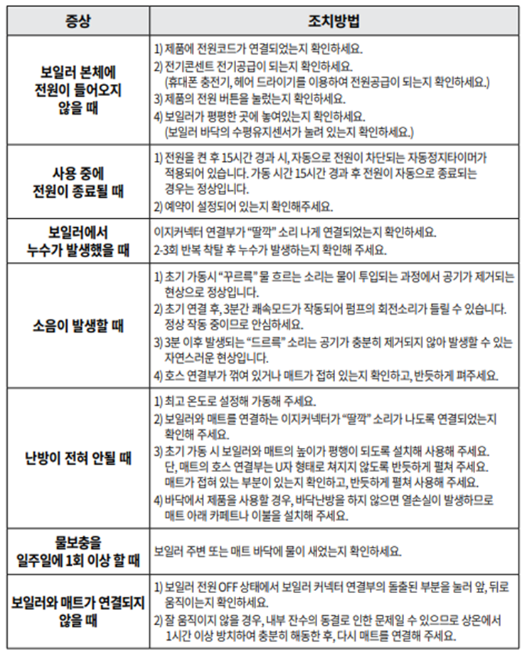 4. 온수매트 일반적인 고장증상 및 조치방법